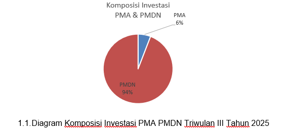 Komposisi penyumbang investasi triwulan III 2025 didominasi oleh investasi PMDN. Nilai investasi PMDN sebesar Rp351,90 miliar dan PMA sebesar Rp Rp21,86 miliar. PMDN berkontribusi terhadap total investasi sebesar 94% dan PMA sebesar 6% sebagaimana pie chart dibawah. PMDN yang besar didominasi kontribusi dari investasi usaha mikro dan kecil yang menunjukkan ketangguhan UMK mendorong kinerja perekonomian daerah
